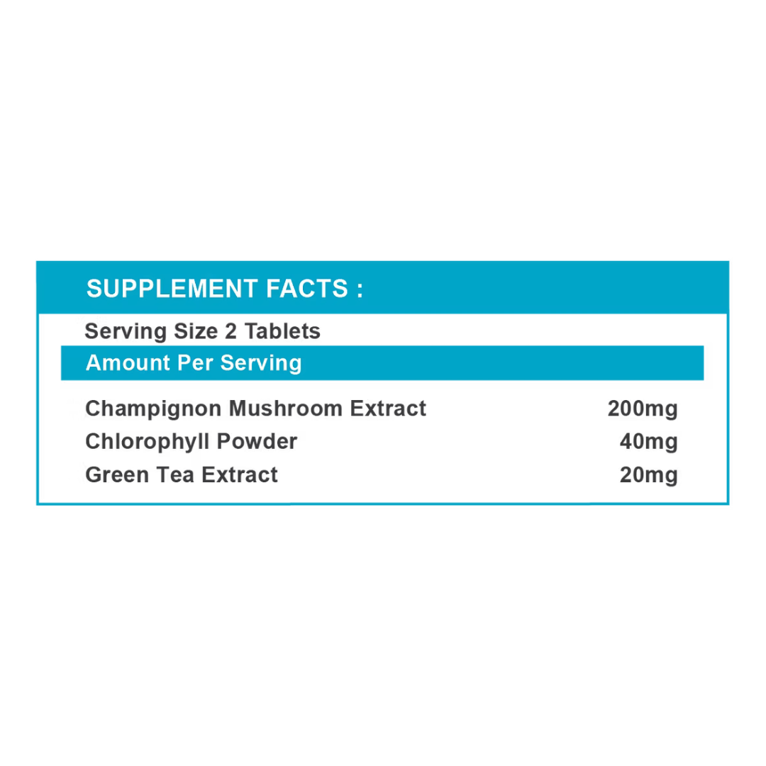 - Champignon mushroom neutralises odour-causing substances such as ammonia, hydrogen sulfide, amine, indole and skatole that are generated in the intestines. Chlorophyll is effective in reducing and eliminating bad breath and other forms of odours in the body. These two natural ingredients act directly on the root causes of unpleasant odours to effectively eliminate bad breath, body odour, smelly urine and poops.