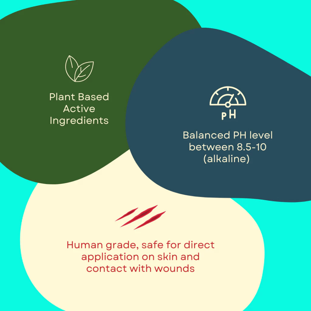 Sterilize up to 99.9%, human grade and safe for direct application on skin. Eliminate malodor source of bacteria, fungus and volatile organic compounds. Soothing on skin. pH level 8.5-10. Safe for direct application on wounds and if accidentally ingested.