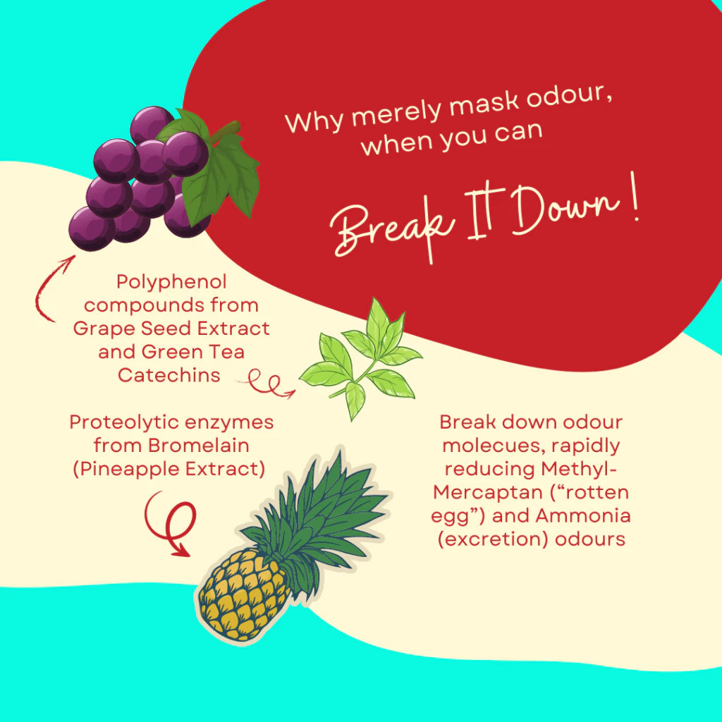 Active Ingredients: Polyphenol compounds abundantly present in Grape Seed Extract and Green Tea Catechins, and proteolytic enzymes from Bromelain removes odors by breaking down odor molecules, rapidly reducing Methyl-Mercaptan (“rotten egg”) and Ammonia (excretion) odors, sterilizing and inhibiting bacteria growth without irritating the skin.